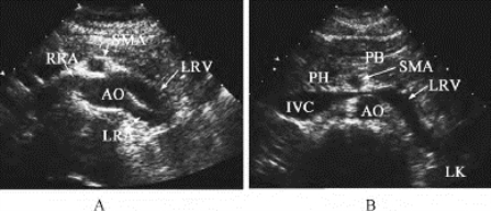 图A示左、右肾动脉及左肾静脉;图B示左肾静脉及下腔静脉