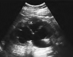 3.重度肾积水超声表现 肾脏增大,肾实质明显变薄,肾盂肾盏明显扩大,相邻肾盏互相交通,并与肾盂相通(图29-6)。