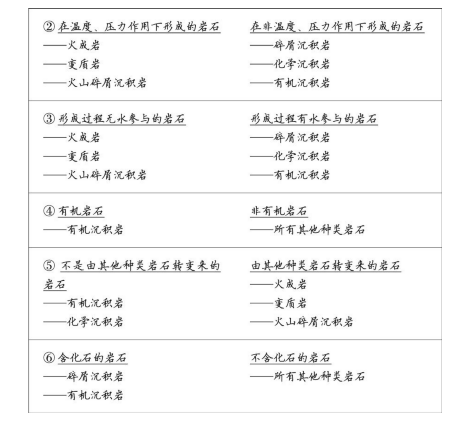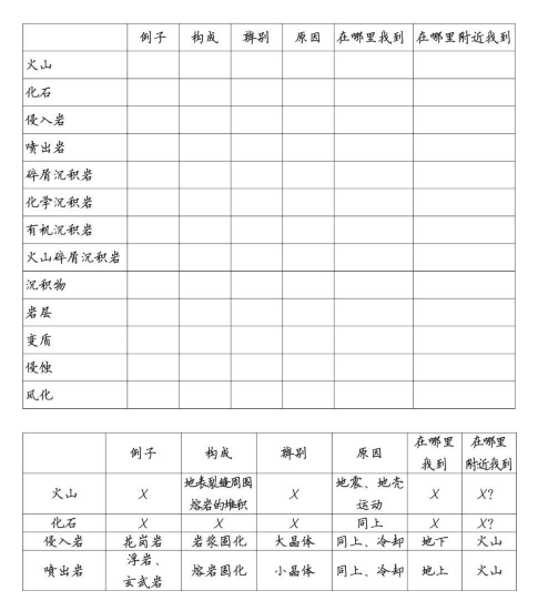 ● 可以用多少种不同的方式来比较各条信息?我们可以比较岩石的形成方式、形成的地理位置或是形成来源,等等。你应该尽可能多地尝试用不同的方式去重新组织信息。