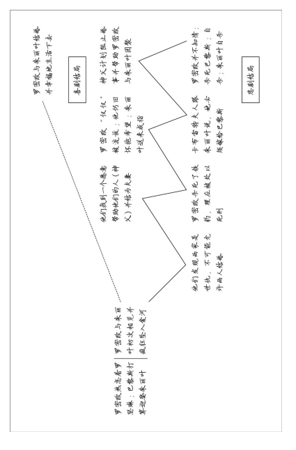 我用了一条上升的虚线来表示指向罗密欧与朱丽叶理想结局的情节发展(没有冲突和阻碍)。这个图表同时还标明了情节要点(故事的转折点)。
