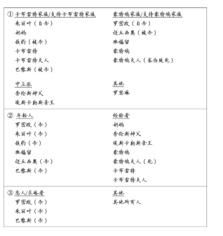 如果你看一下我的分组,你会发现一些有趣的现象,比如,卡布雷特家族与蒙特鸠家族最后的死亡人数大致相当;从第二种分组方式中,我们可以看到,除了蒙特鸠夫人外,其他的死者都是“年轻人”,而不是“经验者”;从最后一种分组方式中,我们可以看到两位恋人和一位求婚者的结局都是死亡。我所观察到的这几个现象,都可能出现在考试或论文中。
