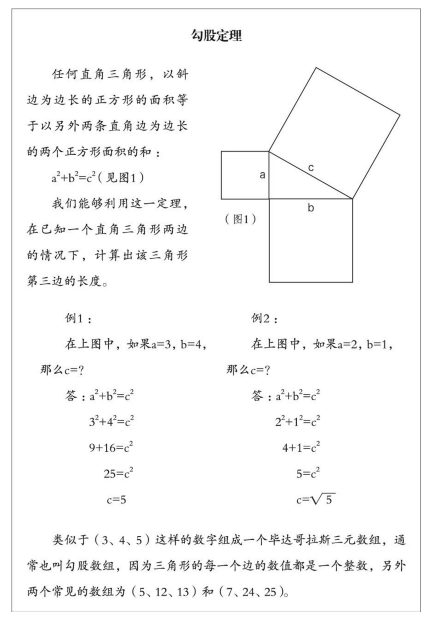 在你学习一个概念或技巧的时候,你经常会遇到一些特殊例子。比如,正方形就是一个特殊的长方形,等腰三角形就是一个特殊的三角形。我们例文中勾股定理那部分就提到了几个这样的特殊例子。这些特殊的例子往往值得你单独记忆。