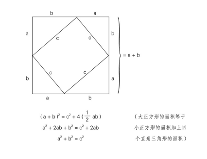 并不是所有老师都要求学生能够自己推导出相应的公式,但是知道那些公式是怎么来的,能够很大程度上提高你对这个公式的理解。下图中,我们将一个小正方形放在一个大正方形内,通过这样一个简单的几何推导,就可以证明勾股定理是正确的。