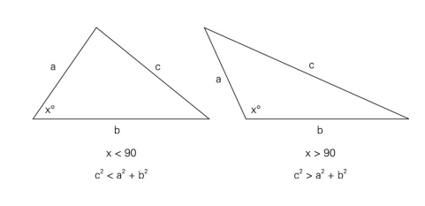“如果……”这种问题是我们的老朋友了,让我们带着这个问题一起来看看勾股定理。根据勾股定理,任何直角三角形,以斜边为边长的正方形的面积等于以另外两条直角边为边长的两个正方形面积的和。如果我们把直角变成锐角或者是钝角的话,相对应的正方形面积的关系会是怎样的呢?
