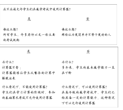 第四步要求你要形成自己的主张,如计算器在教室中的使用应该被允许还是不应该被允许?