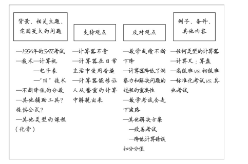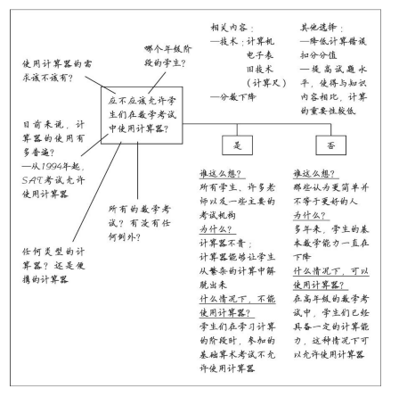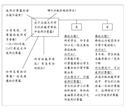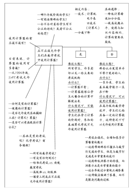作答说明:拿出一张纸,将我们的论述问题“应不应该允许学生们在数学考试中使用计算器?”写在纸的中央,然后在文字外围画一个文本框,文字简略、字体尽量小,因为你将在这张纸上写很多你要问的其他问题。我们将这张纸命名为“对话页”。