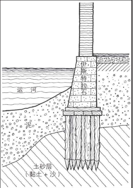 打完桩,再挑选耐海水腐蚀的石头,层层垒上,最后在石头缝隙间灌上水泥固定。建筑物的地基以及被称为fondamenta的河岸地基,都是用这种方法建成的。fondamenta译为河岸是根据其使用目的,原意则是地基。