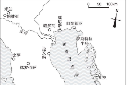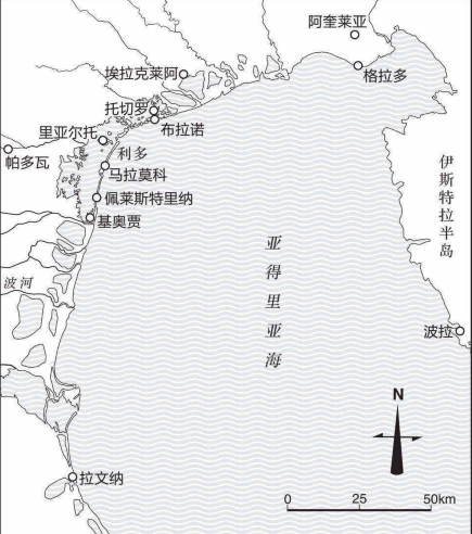 不过没人想往山里逃。这一带是由几条流向大海的河川汇集而成的平原,大家都很清楚,如果往对面的远山跑,恐怕来不及到达目的地,途中就会被追来的蛮族杀死。那么,不如沿着海岸线南下,逃往帕多瓦(Padova)或是更南面的拉文纳(Ravenna)。