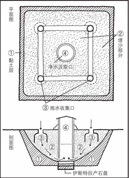 接下来,将一个上方四角开洞,下方无底的箱子埋入沙中。地面上的雨水会流入洞内,经过沙层过滤后,沿着炒菜锅锅底般形状的黏土层,汇集到水池的中央。池中央装有耐海水腐蚀的伊斯特拉产石盘,过滤后的雨水储蓄在石盘上,逐渐注满水井,等着人们汲取。