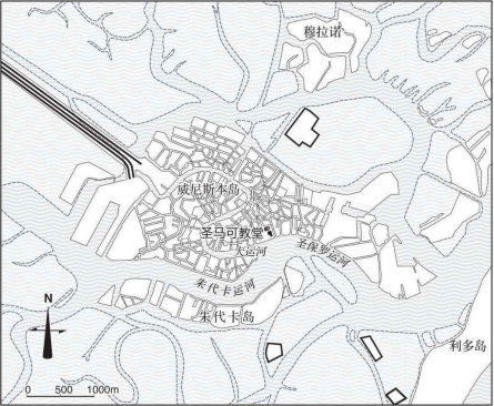 这样,众多的岛屿像“寄木细工[1]”一样被拼装起来;运河蛛网般密布其间;河上建起鳞次栉比的桥梁,威尼斯城就此成形。