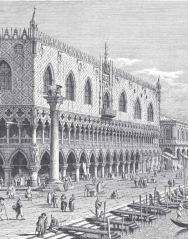 从利多去威尼斯,只需在海上直行便可抵达。一路所见,不禁令我想起去佛罗伦萨郊外别墅时的情景。大门口有一排柏木树,笔直地伸向别墅,沿着一棵棵大树往里走,大屋的正面渐渐地呈现在眼前。同样,当船接近威尼斯城时,首先看见的是清晰可数的宫殿的窗口,接着映入眼帘的,是宛如精致的蕾丝般的窗饰。待船继续前行,两岸一边是威尼斯城东的国有造船厂,另一边是圣乔治和朱代卡岛,那些站在玫瑰色元首官邸廊柱下的人们的表情似乎一目了然。此刻,大运河的河口就在眼前。