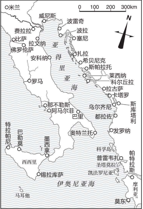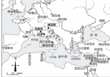 有关威尼斯的部分,已经在本书的第一章中详细地讲述了它的诞生经过,这里就不再重复。威尼斯虽然不是群山环抱,但土地面积仅够人们居住,几乎没有任何耕地,交通完全依赖船只。可以说,地理条件比阿马尔菲和热那亚更为恶劣。