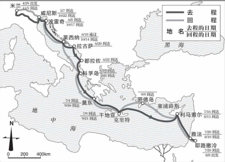 在从威尼斯出发的朝圣者中,居住米兰的桑多·布拉斯卡的旅程算是最便捷的,但他在4月29日出发,到11月5日才回到故乡。像来自德国的施密特,或是法国的朝圣者,恐怕还得再加上两个月的时间。那两位在耶路撒冷与朝圣团分开后,环西奈半岛,再从亚历山大港返回的走“特别行程”的英国人,前前后后起码需要一年的时间。