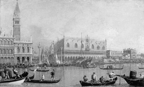 “博其罗”满载着心潮澎湃的旅人们,沿着潟湖的水流前行,然后犹如小溪汇入大海般自然而然地进入了朱代卡运河。这条连接威尼斯城与朱代卡岛的宽阔运河,和其他运河一样都是天然水道,如今仍然可通行数万吨级的船只。进入朱代卡运河后,“博其罗”即刻向左,朝圣马可码头方向驶去,船的正前方出现了元色官邸的玫瑰色墙壁,这里就是海狸共和国的正面大门,左则便是张着嘴巴的大运河河口。