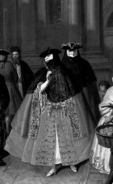 首先,要有一件长至脚踝、能裹住全身的黑色斗篷。这种棉质的黑色长袍威尼斯人一年四季都穿,所以谁家都不会缺。另一件不可或缺的道具就是白色假面。面具用几层白纸制成,用石膏粘住后剪出形状,鼻子像鸟嘴一般突起,只露出眼睛的部分,遮住上半张脸。年轻的女孩子,偏爱戴仅遮住脸中央的黑色假面,然后再覆上白色的丝绸盖住其余的部位。