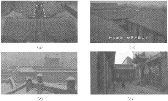 小的自然环境指人物活动的具体环境,如居住环境、工作环境等。小的自然环境可以更好的刻画人物性格。如《大红灯笼高高挂》中毫不吝惜地使用了32个大俯拍全景对壁垒森严、高墙耸立的陈家大院进行反复的渲染和指认,其目的是表现生活在这种“铁屋子”中女人们的悲剧。在这里,成群妻妾演绎着不见硝烟的战争。大太太毓如年老失色,表面看上去已黯然超脱,实际还是不甘心退场,心中揣着“原配夫人”的尊严,她身边的大少爷飞浦成为她唯一可以挣扎的本钱;二太太卓云稳操胜券,得意洋洋;三太太梅姗本性善良,但又不甘寂寞,与高医生私通,这也让她成为陈家大院中唯一一个敢于挣脱铁索束缚的女人,这让她可以获得短暂的自由,追求自己的幸福,可她最终还是没有飞出封建的桎梏,惨死于房顶上的小屋;新娶进门的四太太颂莲,读过半年大学,新时代知识女性的象征慢慢从什么都不懂到看清封建社会的本质;丫鬟雁儿愚昧、无知,心中怀揣着太太梦,一心想登上“太太”宝座,和二太太串通一气算计颂莲,最后做出了无谓的牺牲。在这一群妻妾中,洞察力最强的是四太太,她能闻到这个宅子里有“死人味”,她还率先意识到:“人在这里算什么东西?像狗,像猫,像耗子,什么都像,就是不像人!”这一切的情节都发生在“陈家大院”这个封闭的牢笼中,因此,整部影片中运用的这32个俯拍全景以及声画关系反复描述、象征着对封建礼教的控诉,对交代人物特征、表达剧本最深意起着重要作用(如图4-3所示)。