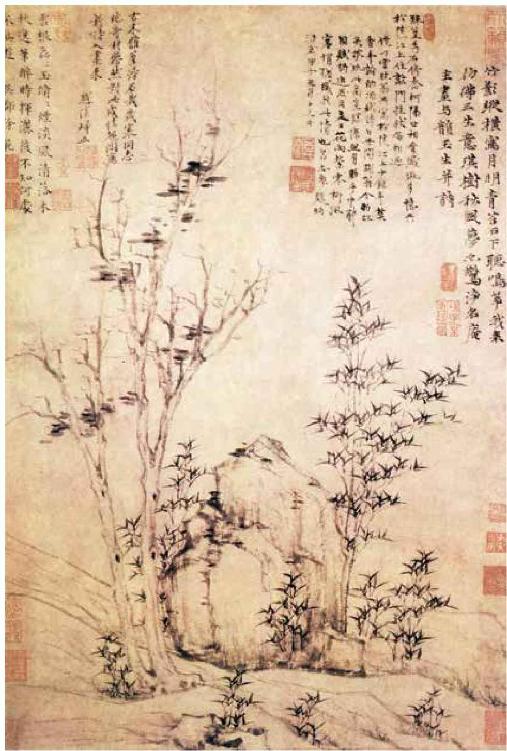 墨竹则有李衎,字仲宾,号息斋,世为燕人。官至吏部尚书,拜集贤殿大学士。文与可、苏子瞻后二百年中,称为杰作。吴郡张逊字仲敏,与息斋同时。画墨竹,一旦自以为不及息斋,即弃墨竹而用钩勒,妙绝当世。柯九思字敬仲,号丹邱生,台州人。官至奎章阁鉴书博士。博学能文,墨竹师文湖州,古木烟梢,极有奇趣。湖州一派,此为最著者也。