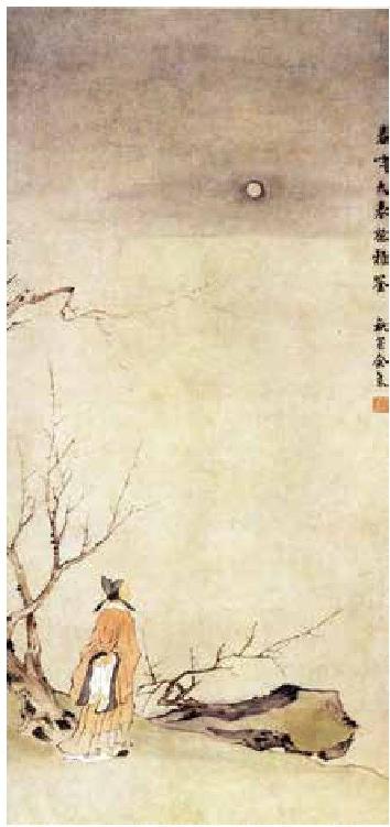 余集《梅下赏月图》 纸本设色,纵65.2厘米,横31厘米 上海博物馆藏