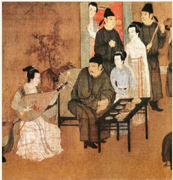 顾闳中《韩熙载夜宴图》(局部) 绢本设色,纵28.7厘米,横长335.5厘米 北京故宫博物院藏