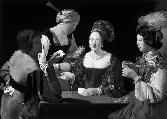 《玩牌的人》(拉·图尔,1635)。16世纪末之后,法国纷争和贵族叛乱不断,几乎陷于无政府的混乱状态