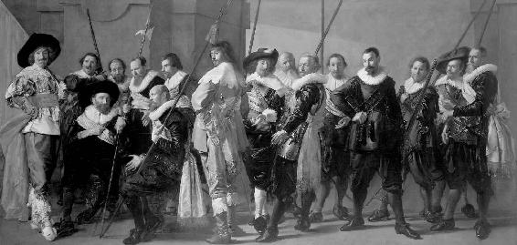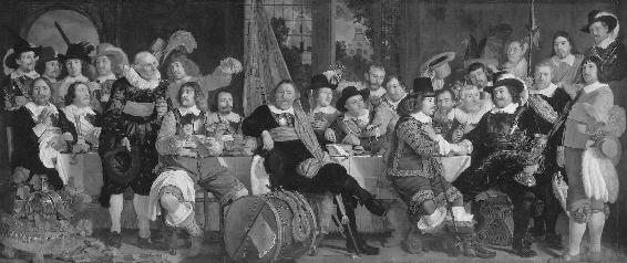 《愉快的伙伴》(The Merry Company)(哈尔斯Frans Hals,1617),画中人物开始显示出荷兰中产阶级特有的自我满足神气