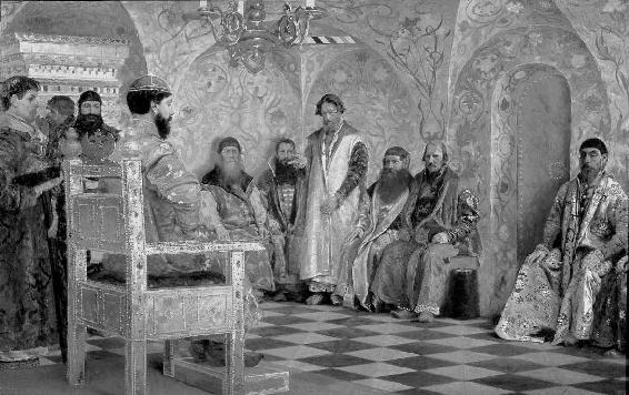 俄国沙皇、罗曼诺夫(Romanov)王朝的创始人米哈伊尔(Michael)在缙绅会议上。米哈伊尔利用缙绅会议作为民众谘询机构,设法使俄国摆脱困境