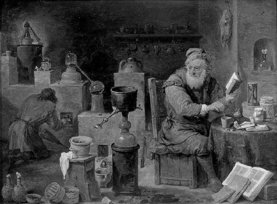 正在工作的炼金术士。制金是欧洲炼金术的主要和唯一目标,包括牛顿在内的一些科学家都曾进行过炼金实验。这些实验为化学积累了大量知识