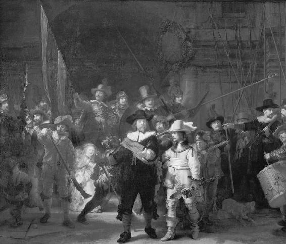 《夜巡》(伦勃朗Rembrandt,1642)。《夜巡》的确切题目应该是《弗朗兹·班宁·柯克上尉的民兵队》