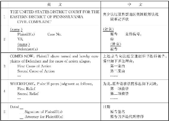当事人及律师制作的民事起诉法律文书通常称为“民事起诉状”,一般要包括原告、被告、案由、请求事项、事实和理由等内容。美国的民事起诉状一般要包括plaintiff(原告)、defendant(被告)、jurisdiction(管辖权)、statement of claim(事实简述)、nature of suit(诉讼的性质)、relief(救济)等内容。(1)具体如下: