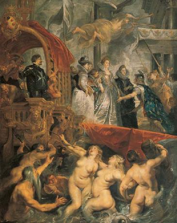 这是出嫁到法国的美第奇家族的玛丽刚登上法国马赛港时的情景。