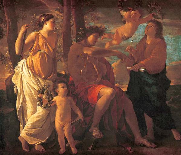 这是法国画家普桑所作的《诗人的灵感》,图中诗人的灵感来自神的授意,而彼特拉克的灵感则来自生活。