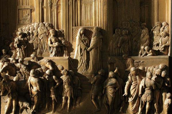 没有人会想象27年的时间是怎样度过的,只记得一年一度花开花谢,燕去蝶飞。吉贝尔蒂用10片镶板呈现出《旧约》的情景,从上帝创造人类到示巴女王拜访所罗门,情景美不胜收。他将镶板的边缘用近乎完美的镶画和精巧可爱的动植物装饰构成了20幅画面。
