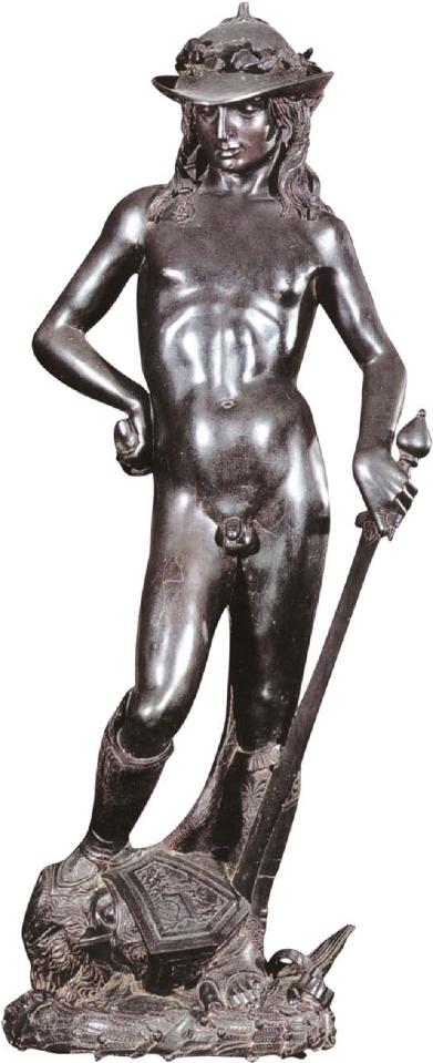 1432年,一座名为《大卫》的青铜雕像在美第奇宫庭园里诞生了。雕像反映的是《圣经》中以色列国王大卫年轻时,面对非利士族对国家的进攻,主动请缨,迎战巨人歌利亚的故事。大卫本是一个牧羊童,但是出于对国家的热爱,他凭借自己的机智和勇敢,利用甩石机将凶神恶煞般高大勇猛、让以色列众将士害怕不已的歌利亚打倒在地,并将其头颅割下,从而才击溃敌军,保护了国家。在这尊雕像中,大卫被塑造成为一个普通的男孩形象,头上依旧是自己的牧羊毡帽,左手握剑,右手持石,脚踩巨人歌利亚的头颅,满脸喜悦,陶醉在胜利的豪迈之中,一改过去教会将大卫幻化为天神的做法。