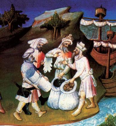 《马可·波罗游记》插图:在云南收集珍珠和采掘绿松石的商人。