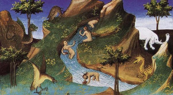 《马可·波罗游记》插图:在印度锡兰山上的河里寻找宝石。