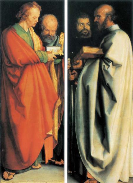 丢勒最著名的油画作品《四圣图》,通过对耶稣手下四个门徒的刻画,成为文艺复兴时期不可多得的经典之作。