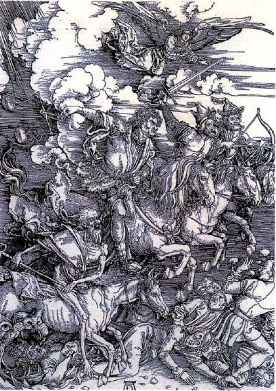 《启示录》是一组木刻版画,作为丢勒第一部伟大的作品,画面故事描绘了来自对罗马帝国尼禄王朝旧基督教的遥远想象。这一作品由15幅组成,其中的《四骑士》和《天使斗恶龙》堪称不朽之作。《四骑士》表现的是疾病、战争、饥饿、死亡降临大地,疾病骑士骑着白马,头戴王冠,搭弓射箭;战争骑士骑着红马,手持宝剑;饥饿骑士骑着黑马,衣着华丽,身材臃肿;死亡骑士骑着灰马,身体半裸。他们神态凶猛,气势磅礴,将灾难带给人间。表现了15世纪欧洲社会充斥的恐怖和失望,封建地主阶层和农民纷争不断,战争硝烟四起,饥饿和瘟疫横行,人民被死亡包围,画面表面上看是对罗马帝国尼禄王朝残暴统治的批判和控诉,实际上暗示教会统治给人民带来的痛苦,具有鲜明的倾向和感染力。而《天使斗恶龙》则表现了天使与恶龙分别代表的光明与黑暗之间的较量,天使身形矫健,深情坚定,透露出作者对光明必胜、人民必胜的愿望和信心。