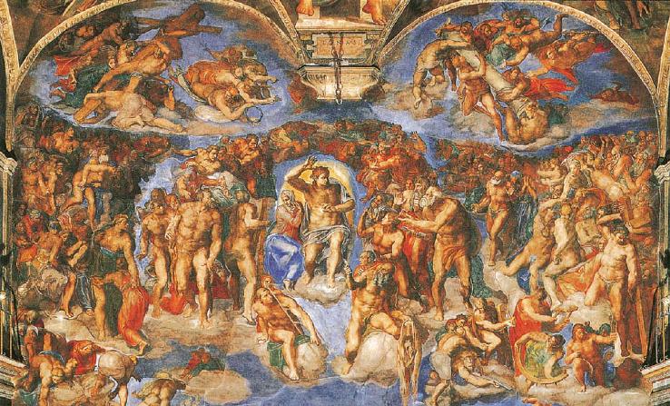 1534年9月,米开朗琪罗开始在罗马定居,同年受保罗三世任命,绘制西斯廷礼拜堂的祭坛画《最后的审判》。已是花甲之年的米开朗琪罗决心创作出一幅超越前人的经典之作。呕心沥血六年之后,另一座艺术丰碑傲然挺立起来,这幅画作自始至终充满着人类对未来的希望,虽然取材《圣经》世界末日来临的故事,但透过画面中200多个巨大的人物造型,主题突出的四个部分,既实现了与天顶壁画《创世记》的完美结合,又通过绝妙的构图,将救世主出现在云端闪电中那种威严、刚毅表现得淋漓尽致。在惊心动魄的场面之中,表达了意大利当时因为失去独立而充斥的狂乱和恐惧,画面中所有出现的人物形象均源于现实生活,大部分人物均为裸体造型,这种歌颂人的力量和优美的举动震惊了整个基督教世界,但由于画作实在太优美,他们在不毁坏作品的情况下不得不将人物添绘上遮羞布而告终。