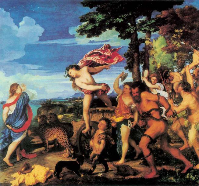 这是提香为费拉拉公爵所作的一幅酒神题材的作品,描绘了酒神巴库斯从印度返回时与阿莉爱德妮一见钟情的情景。
