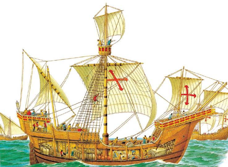 科技的进步使远航成为可能。这是哥伦布探险队横渡大西洋时乘坐的“圣玛丽号”帆船。这艘西班牙北部制造的方形帆船,与此前的旧式三角帆船不同,多桅、多帆,具有船舱宽、速度快、安全性能好等特点。