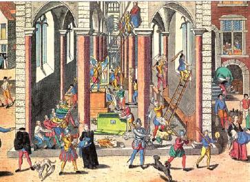 当革命浪潮如狂风一般卷来的时候,养尊处优的贵族才意识到事情的严重性。1566年,当奥兰治的威廉、厄格蒙特伯爵和荷恩大将组成的“贵族同盟”开始向西班牙驻尼德兰总督玛格丽特请愿时,专横的玛格丽特愤怒了,她断然拒绝了他们的请求。彷徨的贵族们正在商量新的对策,却听闻愤怒的人民群众已经掀起了大规模的破坏圣像运动。在昔日神圣的天主教堂和修道院里,随处可见倒塌的圣母像,雕像的碎片更是随处可见,整个教堂内一片狼藉。这次声势浩大的运动,在很短的时间里席卷了尼德兰十几个省,参与人数更是达到了数万人,捣毁的教堂和寺院不计其数。面对革命,西班牙的统治者们束手无策,尼德兰革命正在慢慢靠近。