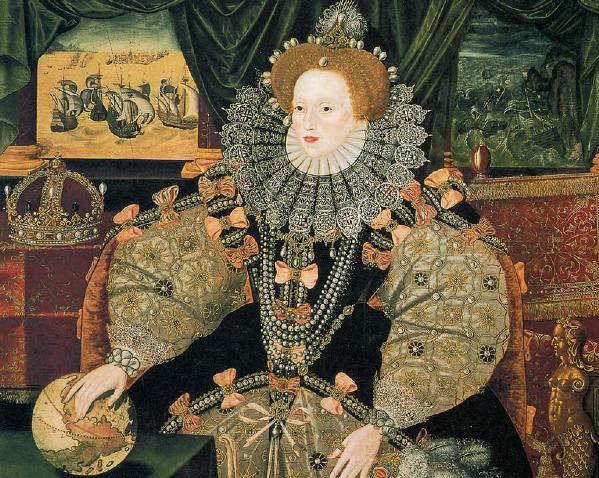 这幅画是为了纪念英国击败西班牙无敌船队而制作的,也叫做《无敌船队肖像》。从画的背景中可以看到战争中的战船。画中的女王正襟危坐,宛如天神一般。