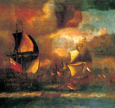 1652年5月,荷兰海军将领特罗普率领着42艘战舰与20艘英国战舰在多佛海不期而遇,霸道的英国海军要求荷兰海军向英国国旗致敬,否则就要用炮弹来迎接他们,于是这场战斗便在一阵阵炮声中开启,荷兰的两艘战舰冒着浓烟和火焰沉入海底。此后20多年,英、荷两国舰队的遭遇战一直持续不断。