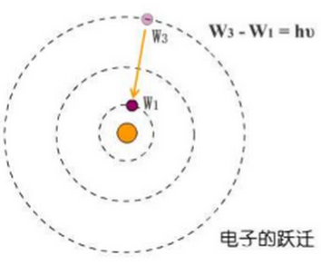 玻尔现在清楚了,氢原子的光谱线代表了电子从一个特定的台阶跳跃到另外一个台阶所释放的能量。因为观测到的光谱线是量子化的,所以电子的“台阶”(或者轨道)必定也是量子化的,它不能连续而取任意值,而必须分成“底楼”,“一楼”,“二楼”等,在两层“楼”之间,是电子的禁区,它不可能出现在那里。正如一个人不能悬在两级台阶之间飘浮一样。如果现在电子在“三楼”,它的能量用W3表示,那么当这个电子突发奇想,决定跳到“一楼”(能量W1)的期间,它便释放出了W3-W1的能量。我们要求大家记住的那个公式再一次发挥作用,。所以这一举动的直接结果就是,一条频率为ν的谱线出现在该原子的光谱上。