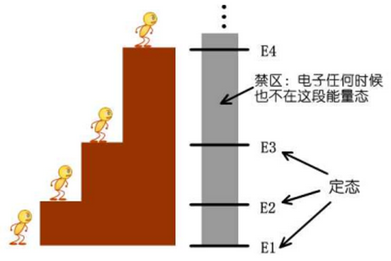 首先,玻尔假设,电子在围绕原子核运转时,只能处于一些“特定的”能量状态中。这些能量状态是不连续的,称为定态。你可以有E1,可以有E2,但是不能取E1和E2之间的任何数值。正如我们已经描述过的那样,电子只能处于这些定态中,两个定态之间没有缓冲地带,那里是电子的禁区,电子无法出现在那里。玻尔规定:当电子处在某个定态的时候,它就是稳定的,不会放射出任何形式的辐射而失去能量。这样,就不会出现崩溃问题了。