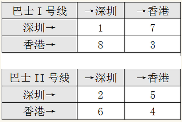 出于寓教于乐的目的,我们还是承接上一节,用比喻的方式来解答这个问题。大家还记得,每张表格代表了一种海森堡式的车费表,那么现在我们的I和II就分别成了两条路线的旅游巴士,在两个城市之间来往,只不过收费有所不同而已。我们把它们称为巴士I号线和巴士II号线。为了再形象化一点,我们假设这两个城市是隔着罗湖桥比邻的深圳和香港。