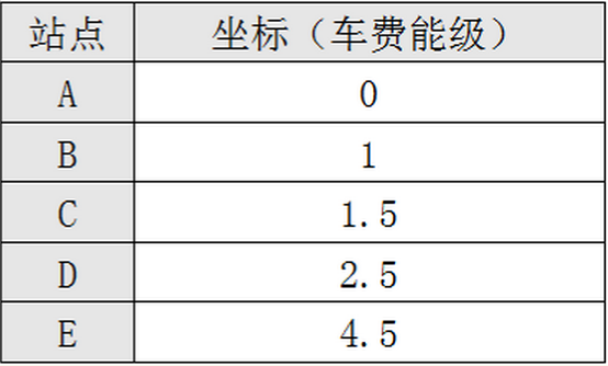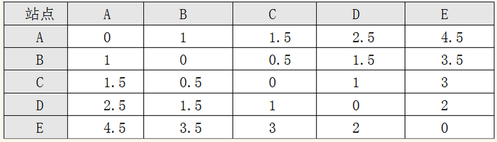 现在玻尔和海森堡分别被叫来写一个关于车费的说明贴在车子里让人参考。玻尔欣然同意了,他说:这个问题很简单,车费问题实际上就是两个站之间的距离问题,我们只要把每一个站的位置状况写出来,那么乘客们就能够一目了然了。于是他就假设,A站的坐标是0,从而推出:B站的坐标是1,C站的坐标是1.5,D站的坐标是2.5,而E站的坐标是4.5。这就行了,玻尔说,车费就是起点站的坐标减掉终点站的坐标的绝对值,我们的“坐标”,实际上可以看成一种“车费能级”,所有的情况都完全可以包含在下面这个表格里: