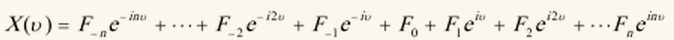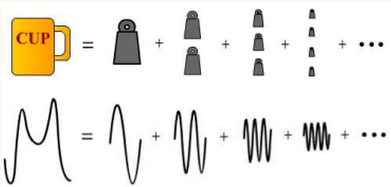 我们的傅里叶展开是一个意思,只不过把那n个重量为10n克的标准砝码理解为频率为nν的标准正弦波而已。这样一来,任何振动也都可以表示为若干个强度为Fn,频率为nν的“砝码”的叠加: