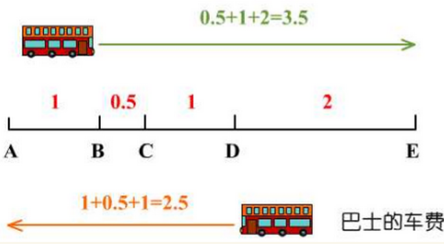 言归正传,让我们假设有一班巴士从A站出发,经过BCD三站到达E这个终点站。这个车的收费沿用了我们怀旧时代的老传统,不是上车一律给2块钱,而是根据起点和终点来单独计费。我们不妨订一个收费标准:A站和B站之间是1块钱,B和C靠得比较近,0.5元。C和D之间还是1块钱,而D和E离得远,2块钱。这样一来车费就容易计算了,比如我从B站上车到E站,那么我就应该给0.5+1+2=3.5元作为车费。反过来,如果我从D站上车到A站,那么道理是一样的:1+0.5+1=2.5块钱。