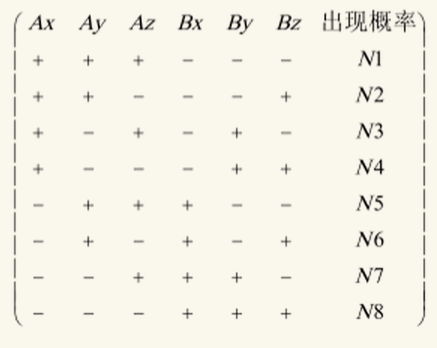从上表可以看出,前4种可能都是Ax为+而Bx同时为-,后4种可能都是Ax不为+而Bx也不为-,所以8行都符合我们的条件,全是正号。我们的结果是N1+N2+…+N8=1!所以(Ax+,Bx-)的相关是1,这毫不奇怪,我们的表本来就是以此为前提编出来的。如果我们要计算(Ax+,Bx+)的相关,那么8行就全不符合条件,全是负号,我们的结果是-N1-N2-…-N8=-1。
